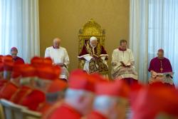 Svolal jsem tuto konzistoř nejenom kvůli třem kanonizacím, ale také proto, abych vám oznámil rozhodnutí velké důležitosti pro život církve. Po opakovaném zpytování vlastního svědomí jsem před Bohem došel k jistotě, že moje síly z důvodu pokročilého věku již nestačí na náležité vykonávání petrovského úřadu. Jsem si dobře vědom, že tato služba pro svou duchovní povahu musí být konána nejenom činy a slovy, ale neméně také utrpením a modlitbou. Nicméně, v dnešním rychle se měnícím světě zmítaném záležitostmi velkého významu pro život víry je pro řízení Petrovy bárky a hlásání evangelia zapotřebí také tělesných i duševních sil, kterých mi v posledních měsících ubylo natolik, že musím uznat svoji neschopnost spravovat úřad, který mi byl svěřen. Proto s vědomím závažnosti tohoto úkonu zcela svobodně prohlašuji, že se vzdávám služby římského biskupa, nástupce svatého Petra, kterou mne pověřili kardinálové 19. dubna 2005, takže od 28. února 2013 ve 20h bude římský stolec, stolec svatého Petra uprázdněn a bude zapotřebí, aby ten, komu to přísluší, svolal konkláve, které zvolí nového papeže.