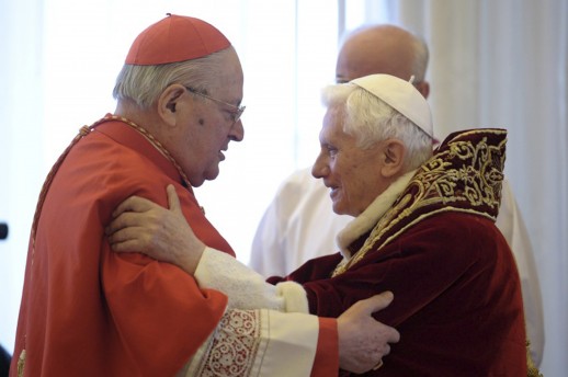 „Svatosti, milovaný a ctihodný nástupce Petrův, jako blesk z čistého nebe zaznělo v této aule vaše pohnuté poselství. Vyslechli jsme ho s rozpaky, takřka nevěřícně. Ve vašich slovech jsme zaznamenali hluboké city, které jste vždy choval k svaté Boží církvi, k této církvi, kterou jste miloval. Dovolte mi nyní, abych jménem tohoto apoštolského večeřadla, kardinálského kolegia, jménem všech vašich drahých spolupracovníků řekl, že jsme Vám více než dříve nablízku, stejně jako během těchto světlých osmi let Vašeho pontifikátu. 19. dubna 2005, pokud se dobře pamatuji, jsem se Vás na závěr konkláve, rovněž chvějícím se hlasem ptal: „Přijímáš své kanonické zvolení papežem?“ a Vy jste bez otálení, byť s rozechvěním odpověděl, že přijímáte s důvěrou v milost Pánovu a mateřskou přímluvu Marie, Matky církve. Jako Maria jste onoho dne řekl své Ano a začal svůj světlý pontifikát v kontinuitě, o níž jste