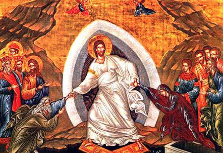 Pán k nim vešel vyzbrojen vítězným křížem. Jakmile ho praotec Adam uviděl, v úžasu se bil v prsa a na všechny volal: „Můj Pán ať je se všemi!“ A Kristus Adamovi odpovídá: „I s tebou.“ Chápe ho za ruku a burcuje ho slovy: Probuď se, spáči, vstaň z mrtvých, a Kristus tě osvítí.5