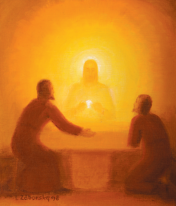 Poutník jejich žádosti vyhověl a zasedl k společnému stolu: Když byl s nimi u stolu, vzal chléb, pronesl nad ním požehnání, rozlámal ho a podával jim. (Vtom) se jim otevřely oči a poznali ho.